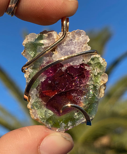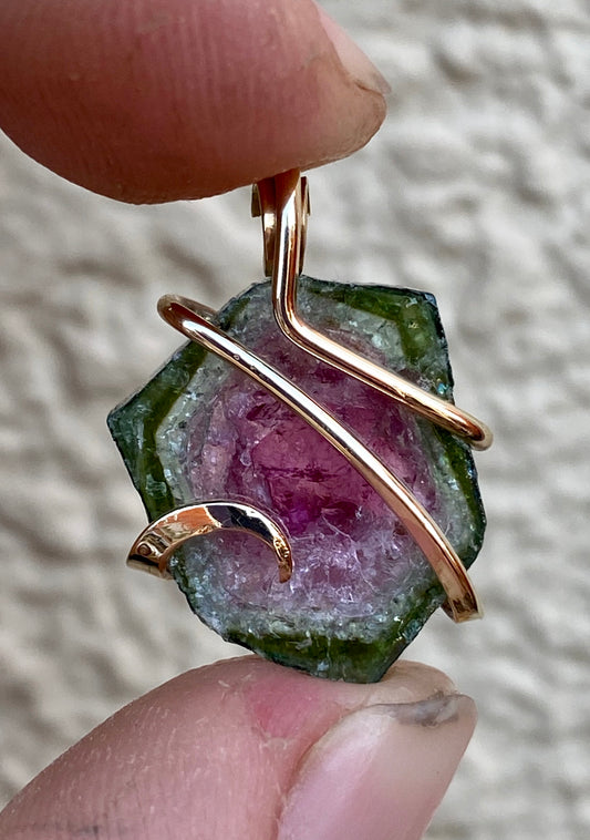 Watermelon Tourmaline Slice in 14kt Gold Tension Wrapped Pendant