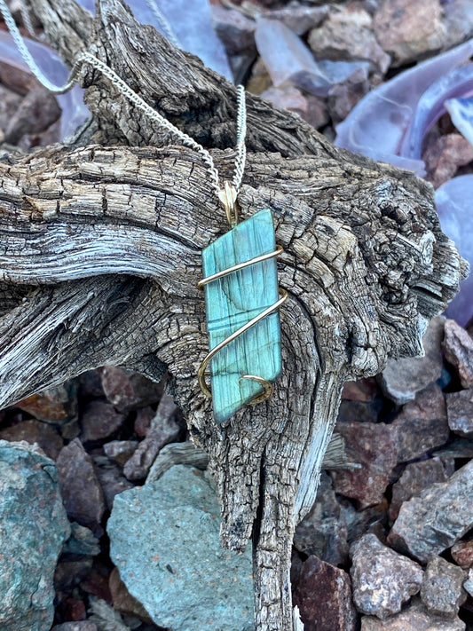 Carved Labradorite Cabochon in 14kt Gold Tension Wrapped Pendant