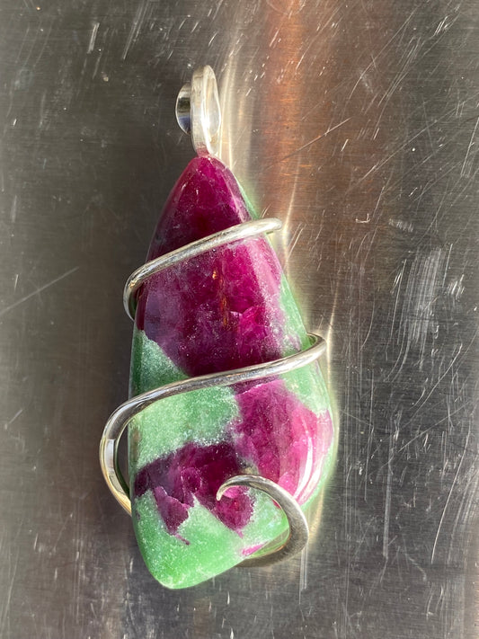 Ruby and Zoisite Cabochon in Sterling Silver Tension Wrapped Pendant
