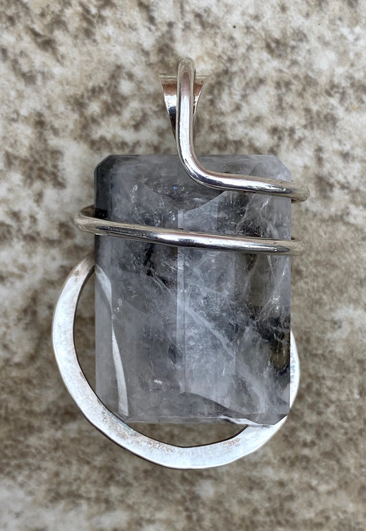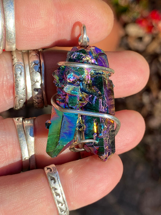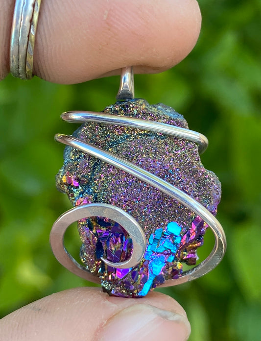 Titanium Infused Quartz Crystal Cluster in Sterling Silver Tension Wrapped Pendant