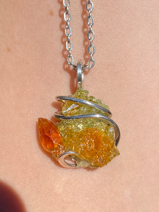 Polish Orange and Green Zincite in Sterling Silver Tension Wrapped Pendant