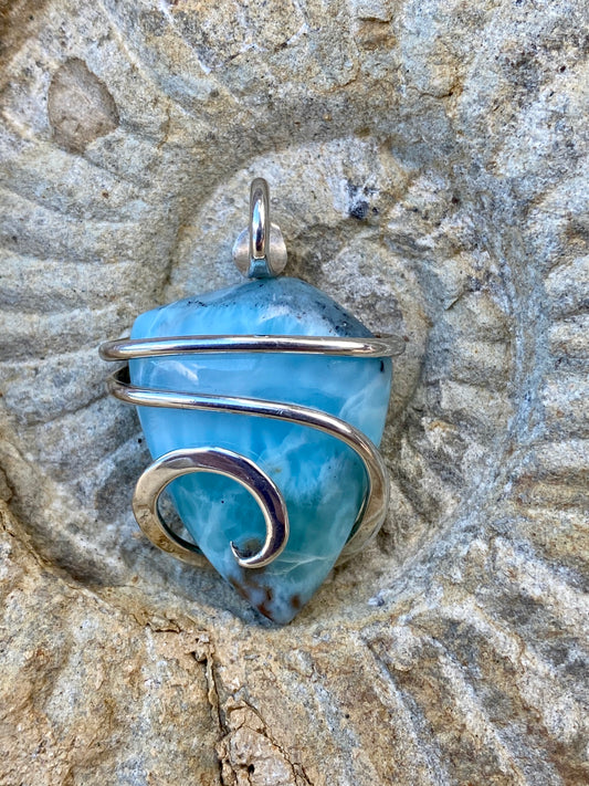 Larimar Cabochon in Sterling Silver Tension Wrapped Pendant