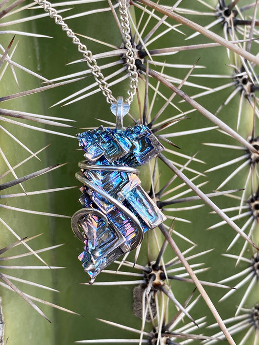 Bismuth Crystal in Sterling Silver Tension Wrapped Pendant
