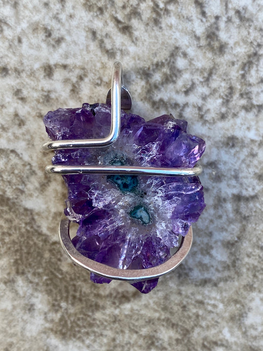 Amethyst Stalactite Slice in Sterling Silver Tension Wrapped Pendant